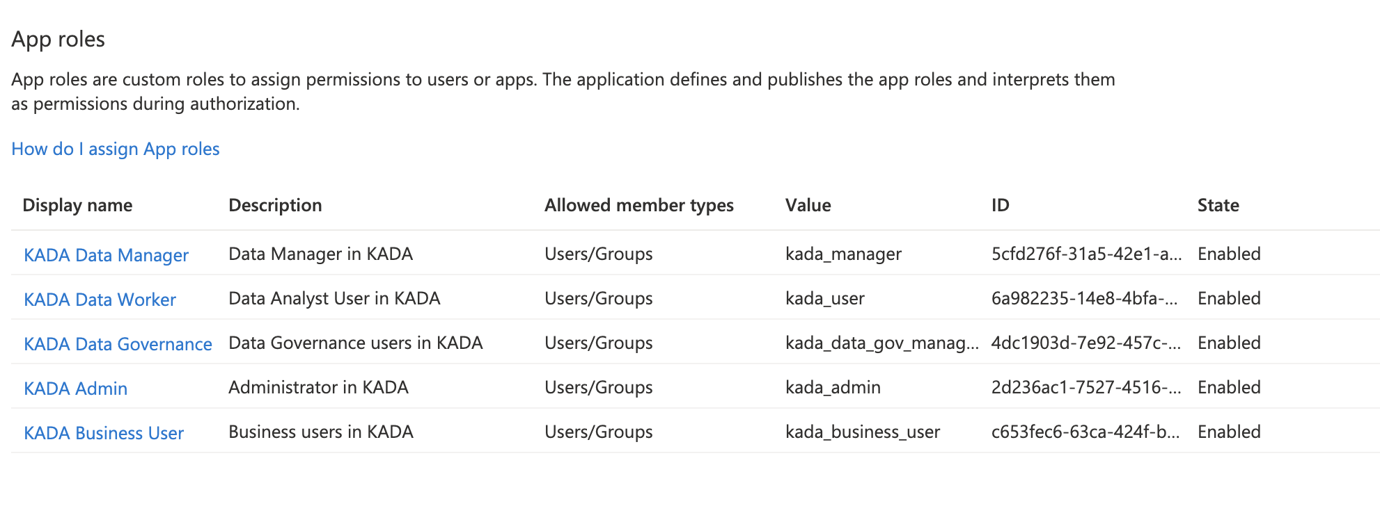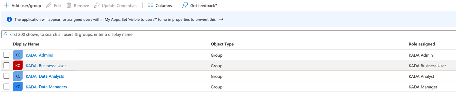 Add the 5 groups you created in Azure AD and assign it to the 5 role you created in the KADA app