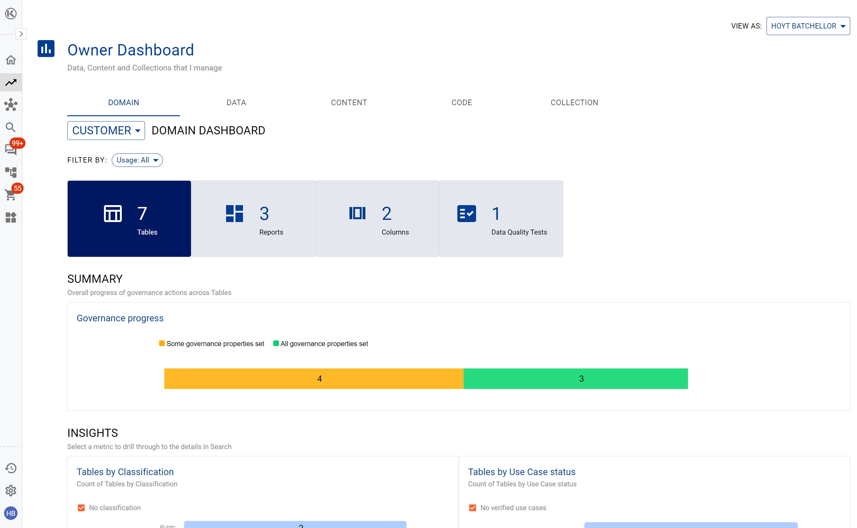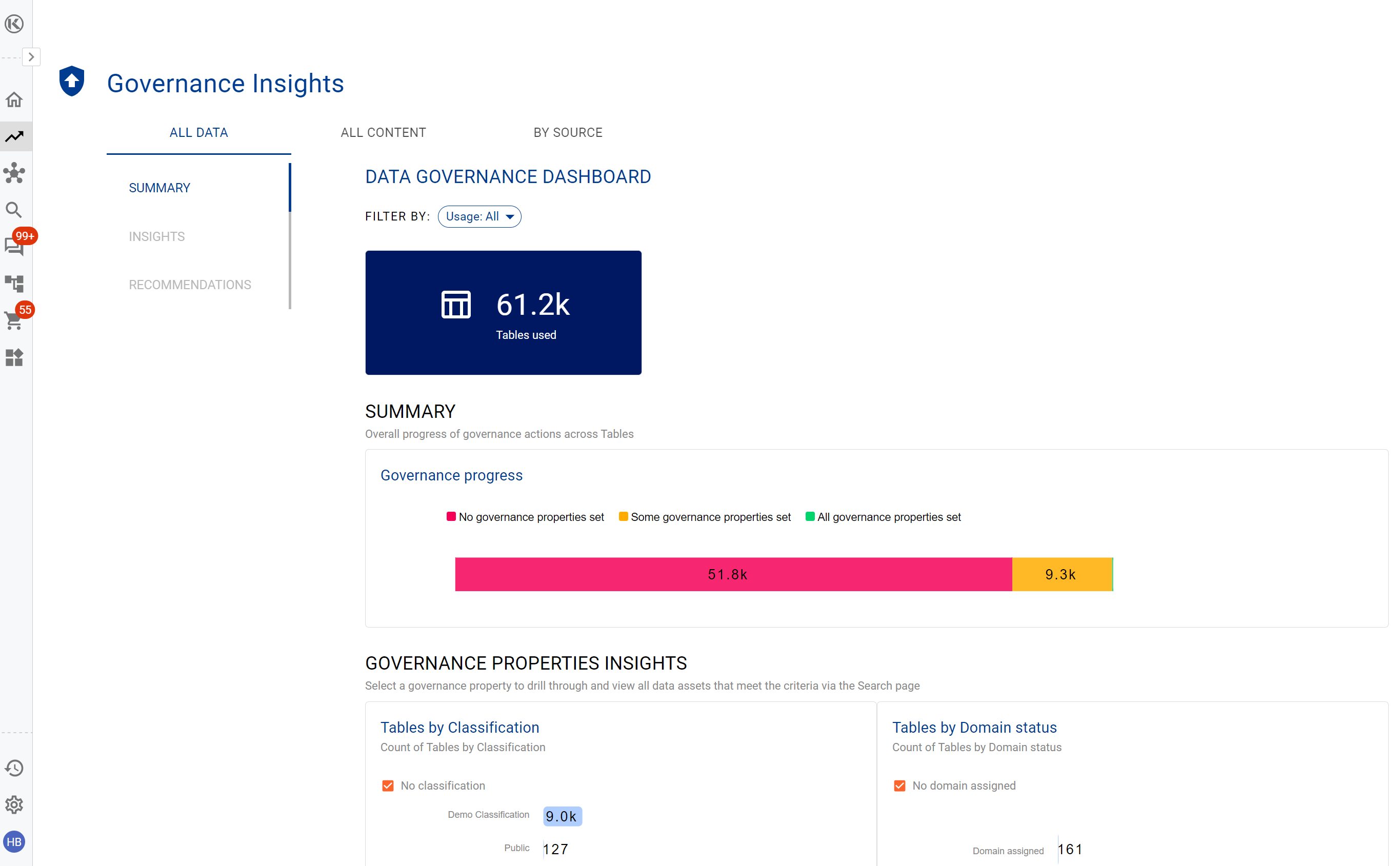 Use the Governance Insights to track classifications, ownership and lineage quality across data assets that are being used.