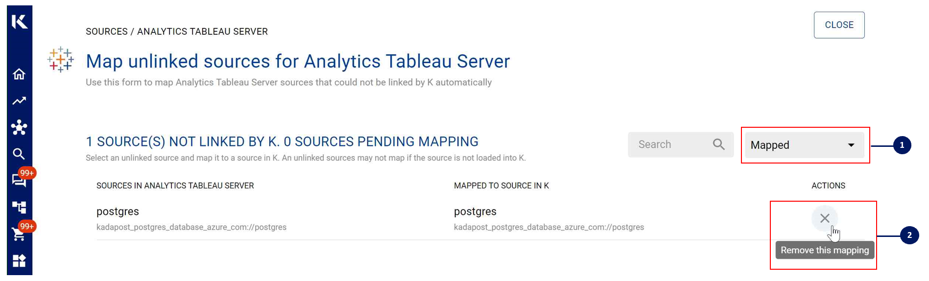 Click on the filter and select Unmapped to review all database sources that have yet to be linked to a corresponding source that has been loaded into K