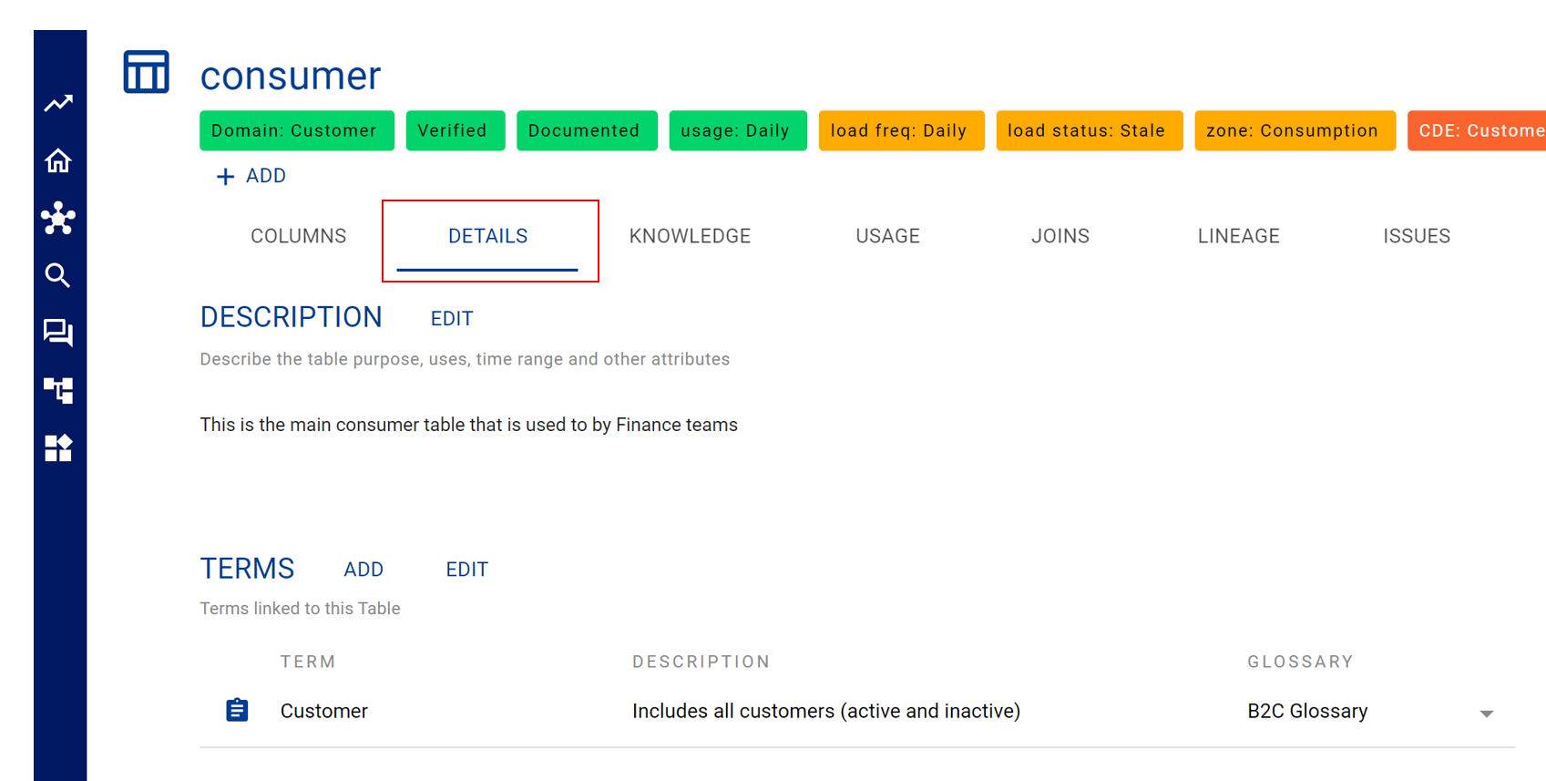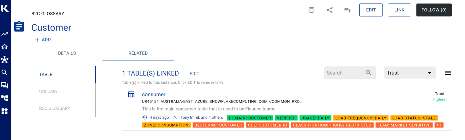 After selecting the Customer term you can see the Details or click on the Related tab to see what data items are currently linked to this term