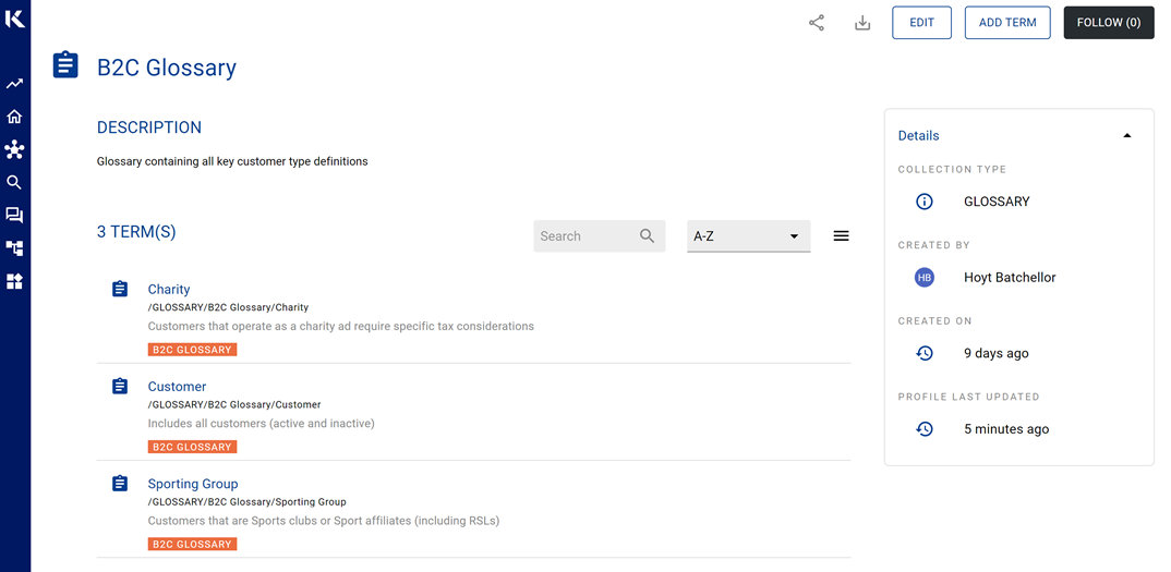 In this example, the B2C was created by Hoyt Batchellor and currently has 3 terms linked.