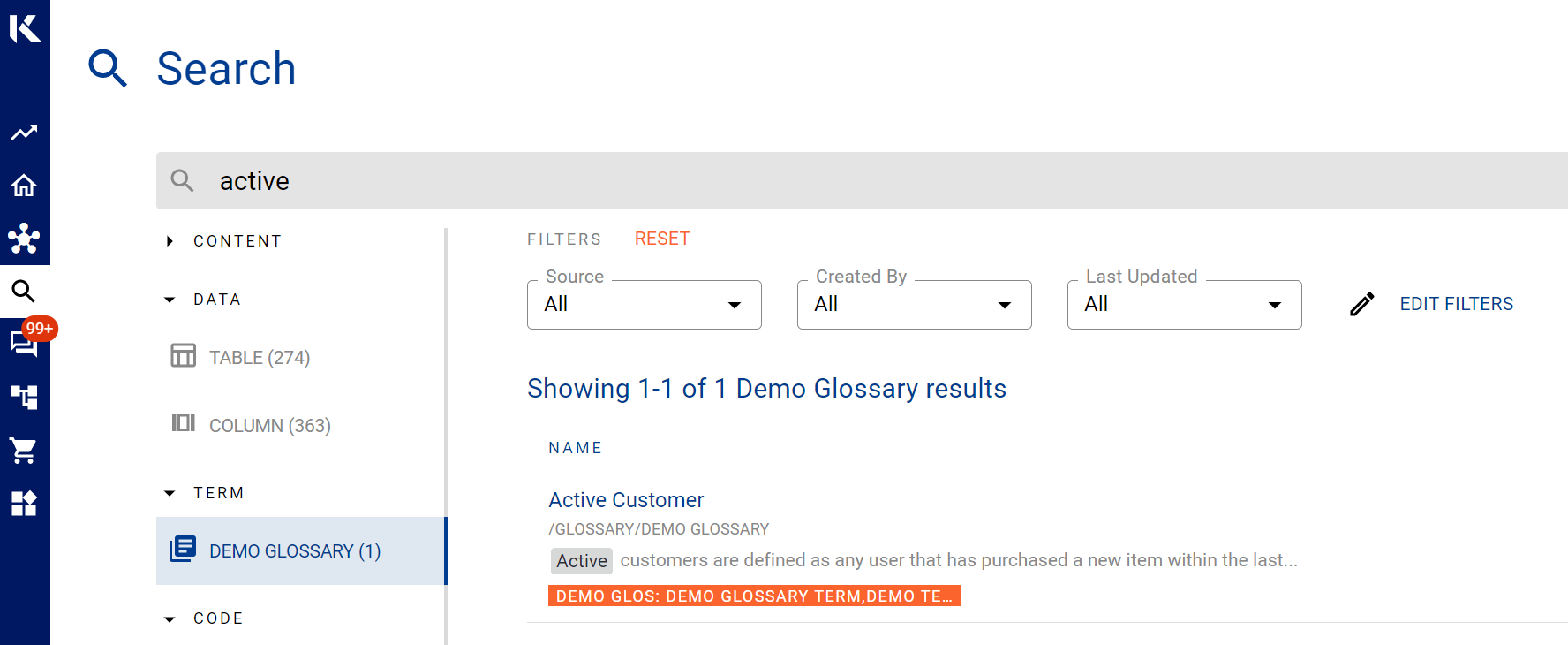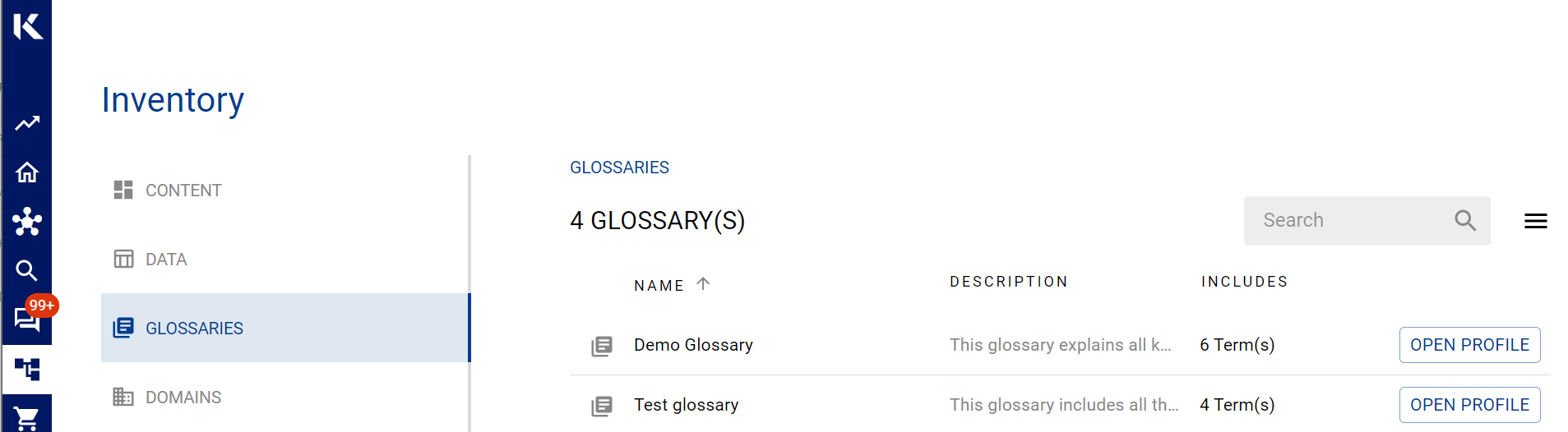 K has integrated glossaries and linked terms in the Details tab of on the Data Profile page. This way when you are accessing a data item, you can quickly navigate and see all the information about the data item on one page.